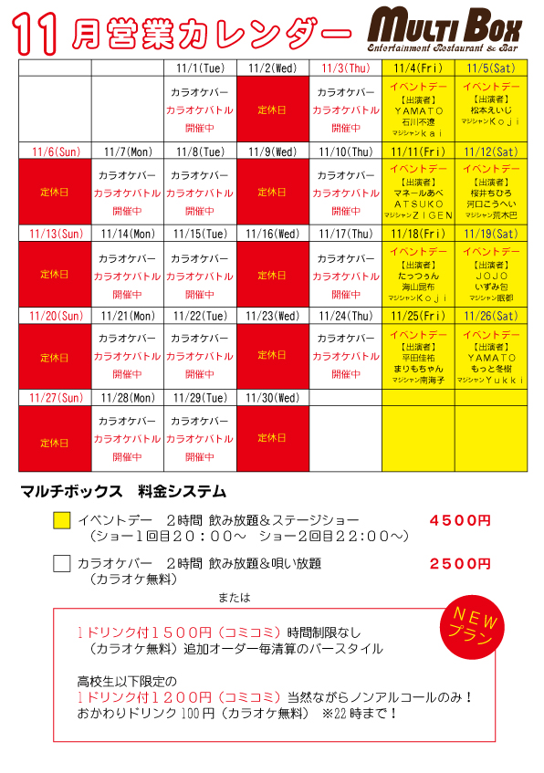 マルチボックス貸切営業について ・平日 ※祝日を除く月~木曜日 ・金土日 ※祝日を含む 上記貸切価格に別途タレントによるショーをご希望の場合 モノマネタレント2名・マジシャン1名 ご質問・ご希望等がございましたら、お気軽にご相談ください。 |